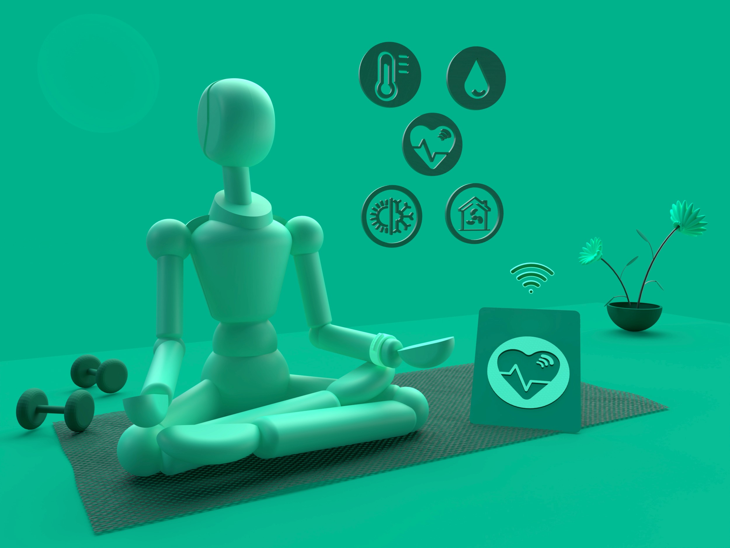 Visualizing the harmony between personal well-being and smart technology. The composition uses a balanced, meditative pose to suggest that advanced monitoring can be seamlessly integrated into a peaceful lifestyle.