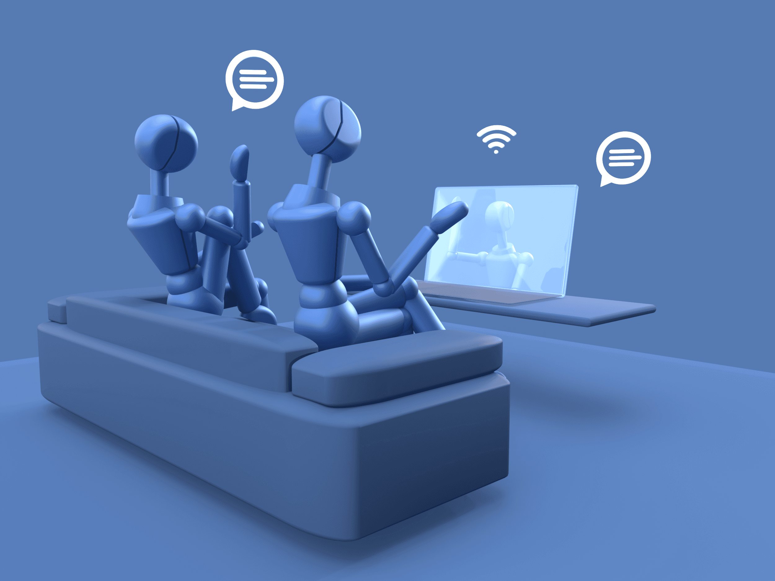 A carefully staged scene depicting modern communication. The posing and layout emphasize the seamless bridge between physical space and virtual interaction.