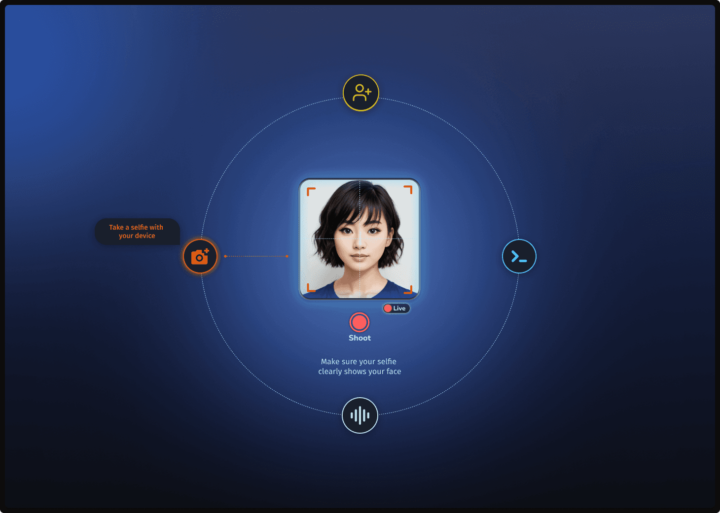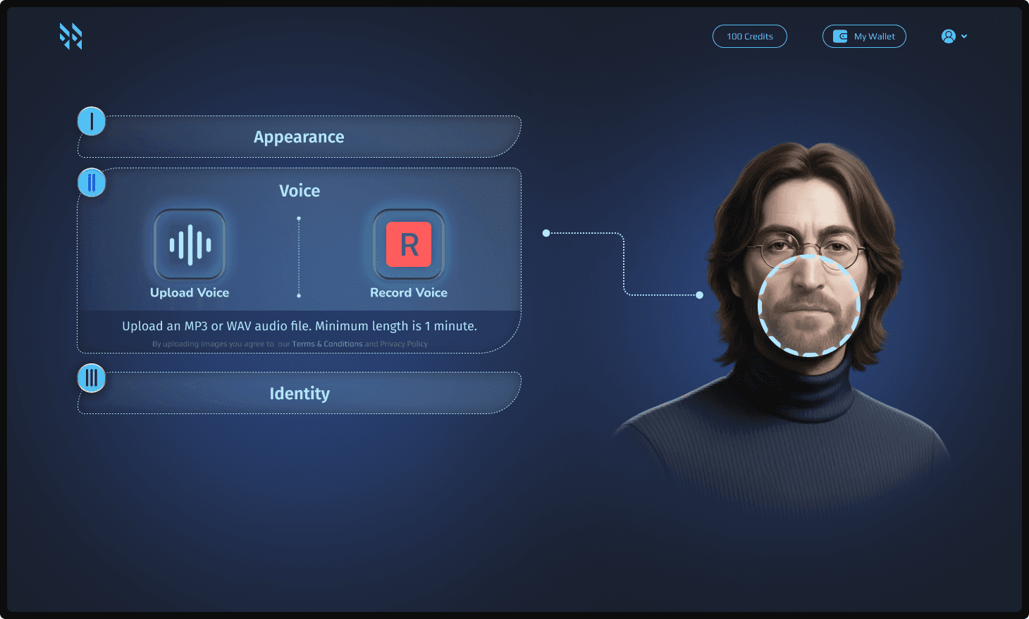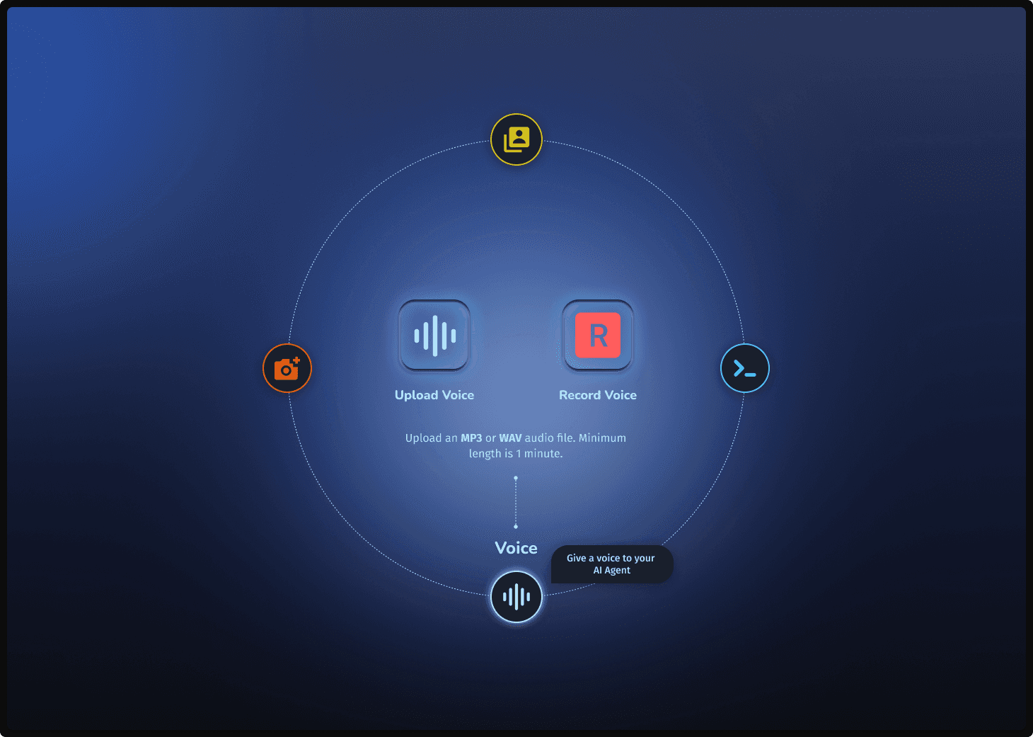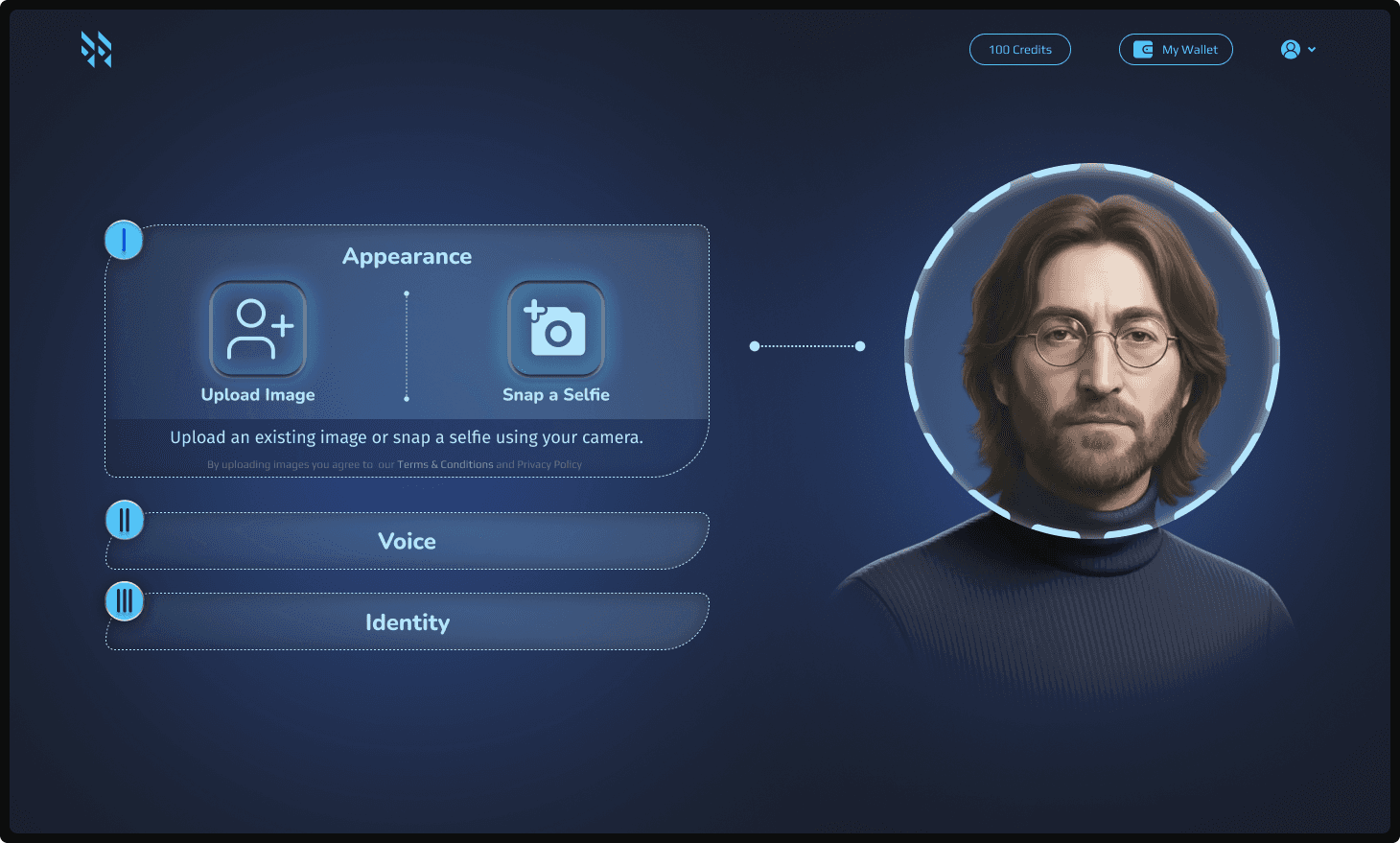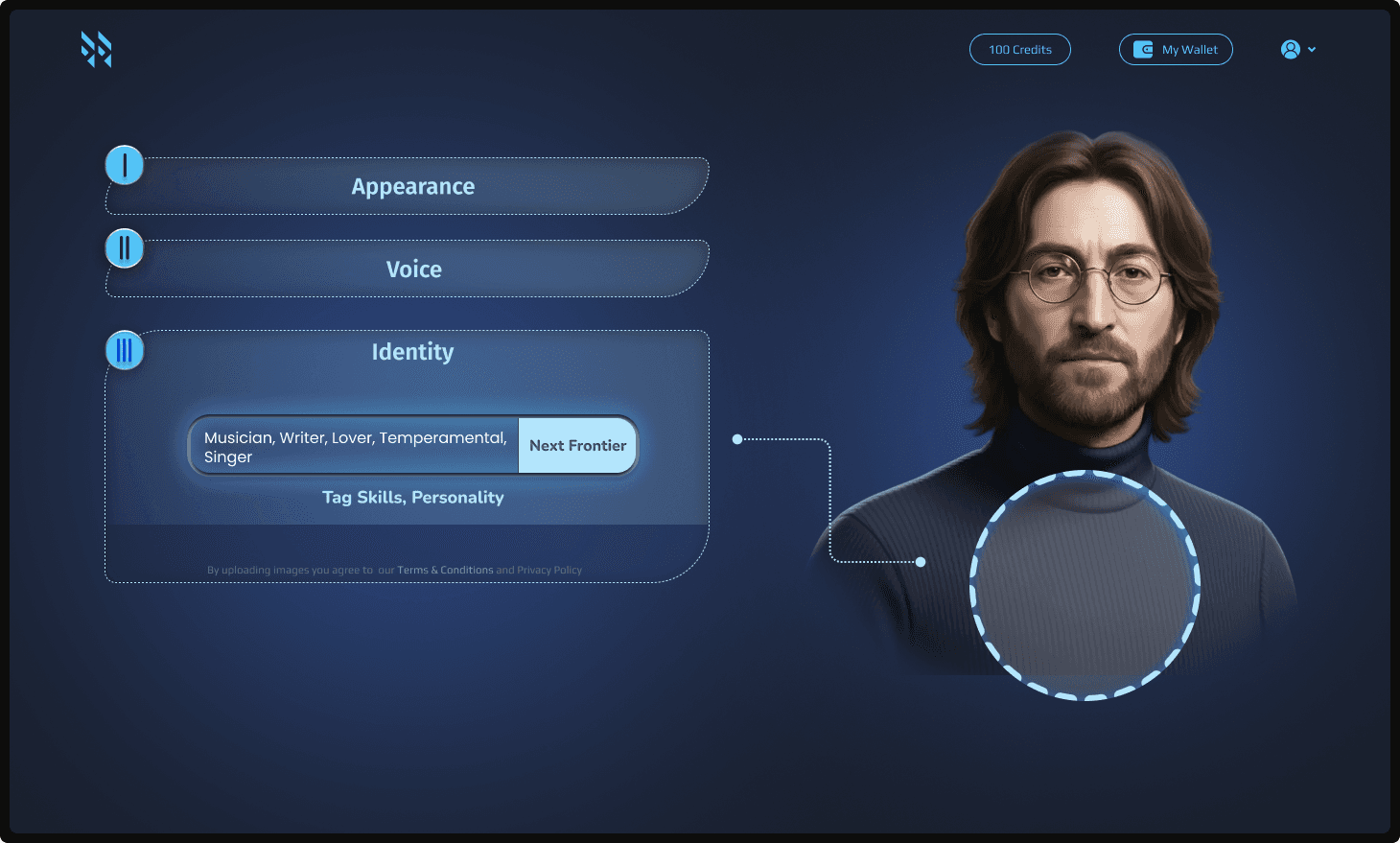 A sequential UI study focusing on the fusion of appearance, voice, and identity. This variation explores a structured, step-by-step assembly process, allowing users to bond visual data with custom vocal and character traits to build a comprehensive AI personality.