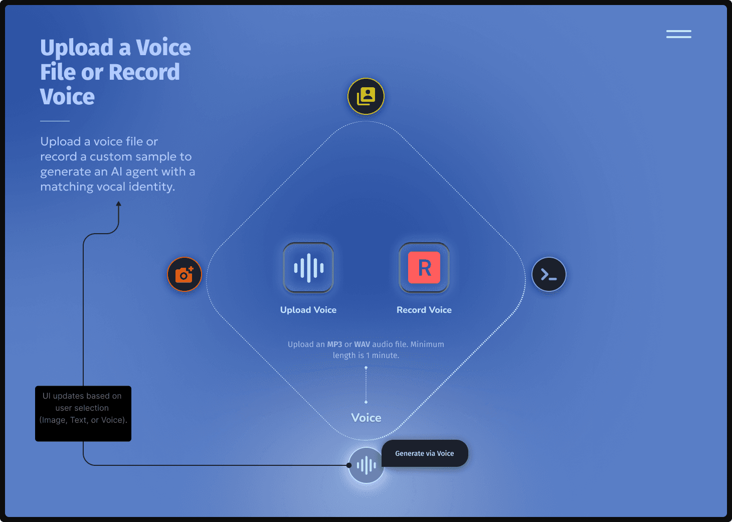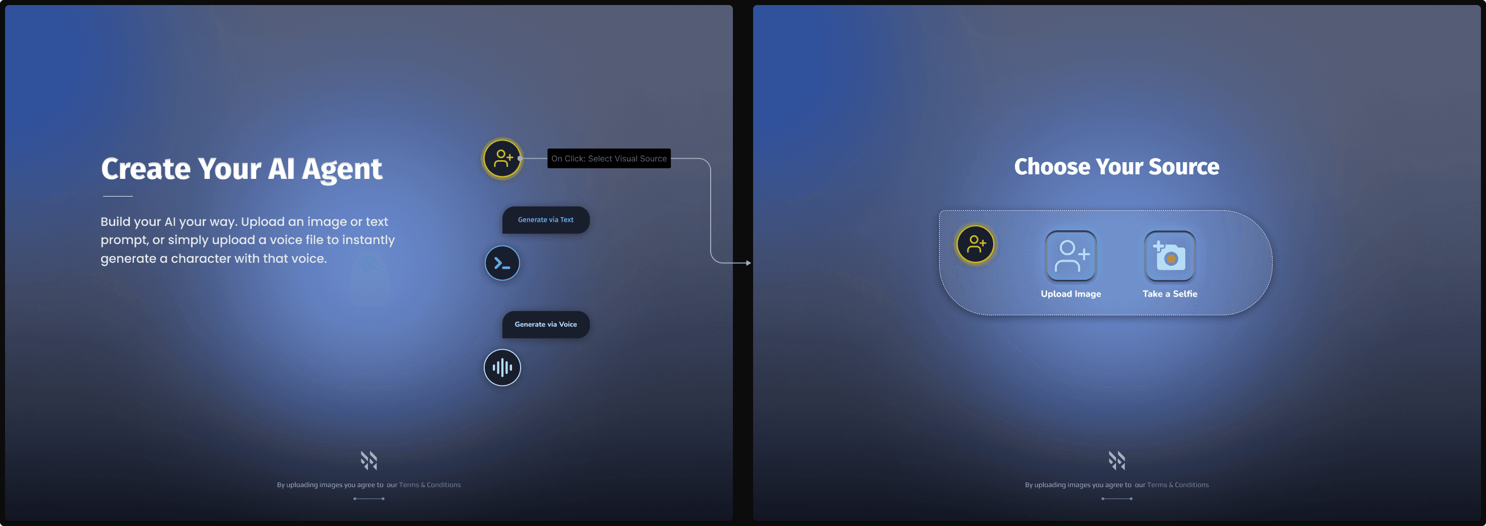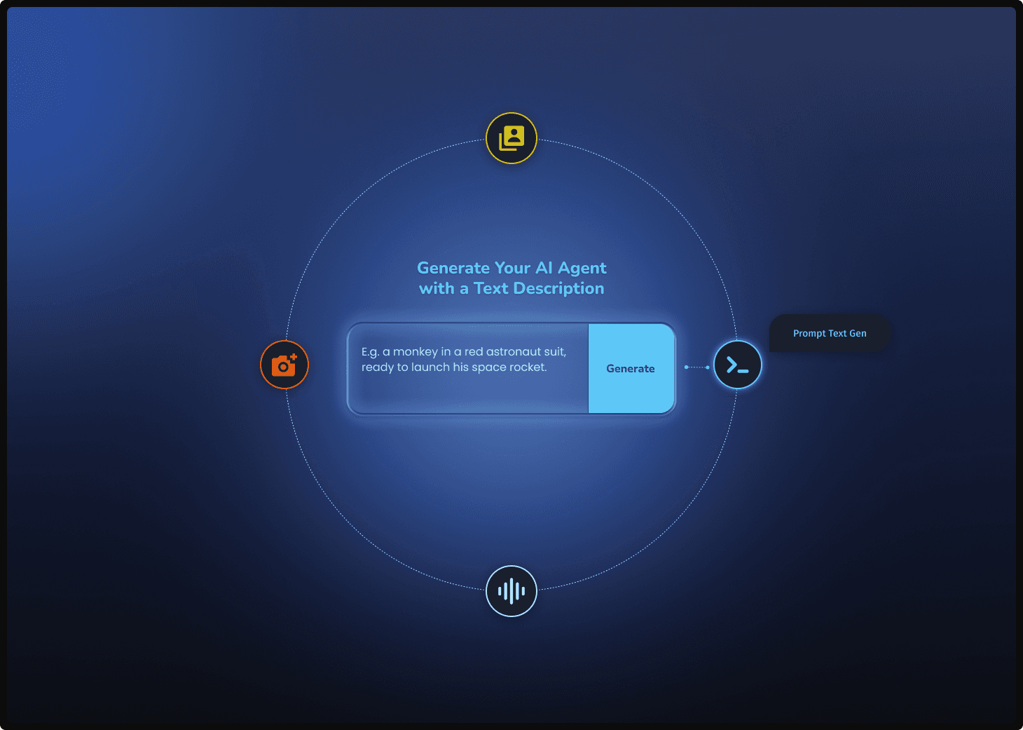 High-fidelity UI/UX explorations for an AI agent generation platform. I focused on visualizing the user flow through multiple entry points including visual, textual, and vocal inputs.